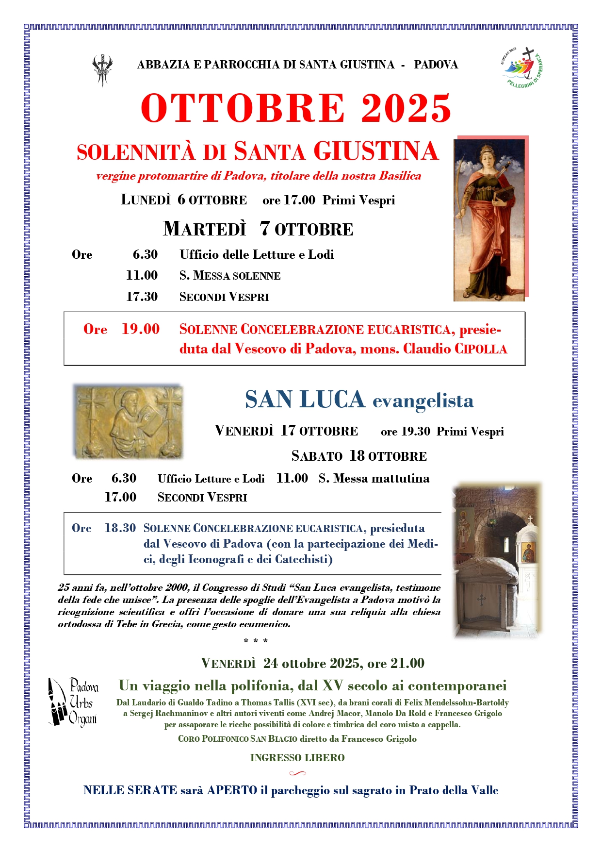 Si pubblicano gli orari delle celebrazioni del mese di ottobre 2025, che coinvolgono la nostra basilica di S. Giustina. Per ogni informazione scriveteci nella pagina dei Contatti!