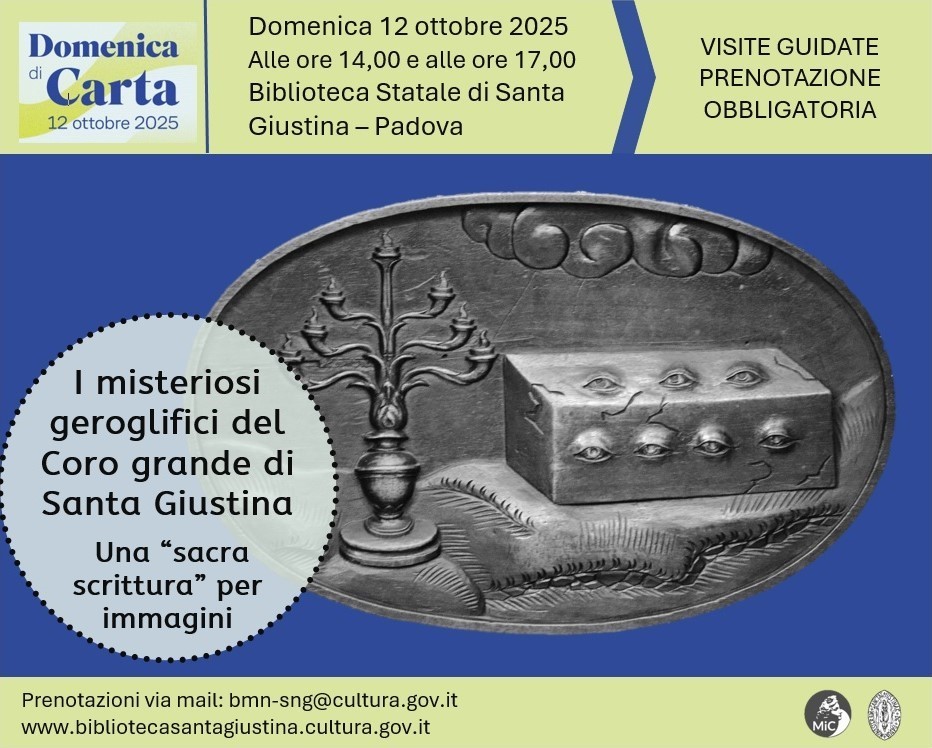 In allegato da parte della Direzione della Biblioteca di S. Giustina, per opportuna informazione, la locandina della visita guidata organizzata dalla biblioteca in occasione della Domenica di Carta (12 ottobre 2025) e che si svolgerà nei locali della Biblioteca e per una breve parte presso il Presbiterio della Basilica, ovviamente in orari nei quali non si svolgono celebrazioni, così da non recare disturbo.
