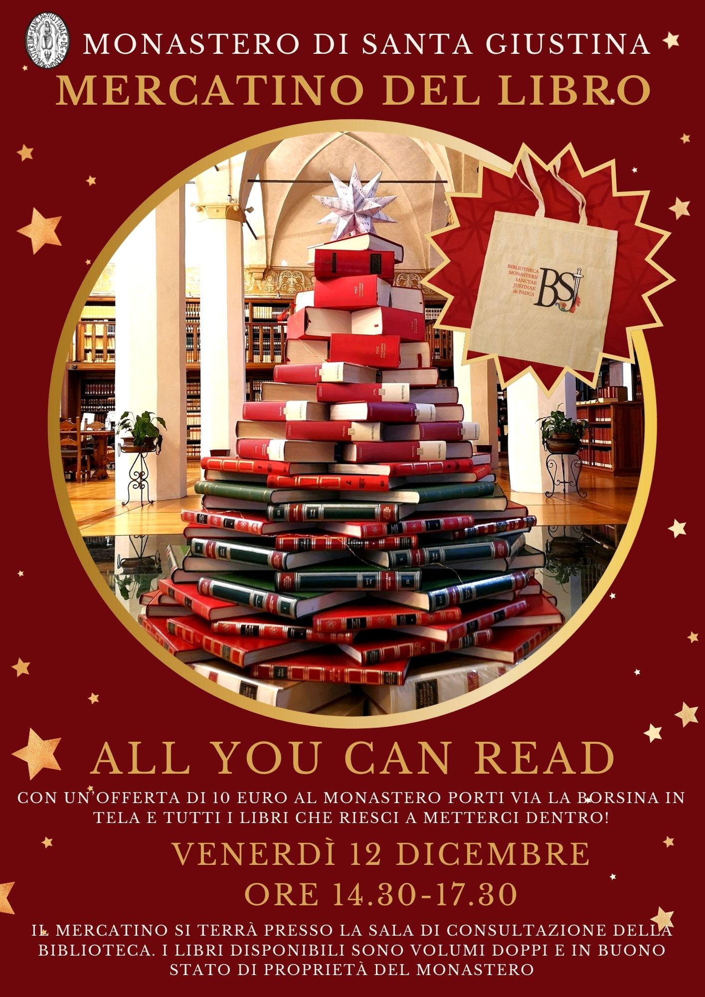 Anche quest’anno il Monastero di Santa Giustina organizza il mercatino natalizio del libro “All you can read”, che sarà ospitato presso la Sala di consultazione della Biblioteca.