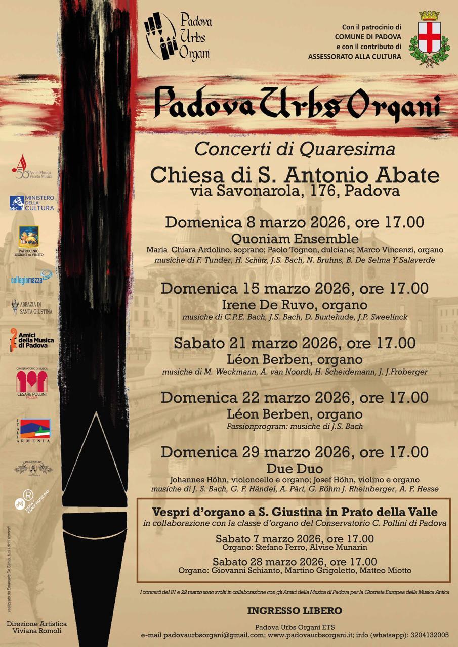 La nostra Basilica di S. Giustina, in collaborazione con gli Enti Locali e il Conservatorio Statale di Musica “Pollini” di Padova, nonché con la proficua collaborazione con Padova Urbs Organi, organizzano per sabato 7 e sabato 28 marzo 2026, alle ore 17 dei Vespri d’Organo, a cura degli allievi della Classe di Organo del M° Pierpaolo Turetta. In allegato le locandine generale e particolari, con il relativo repertorio.