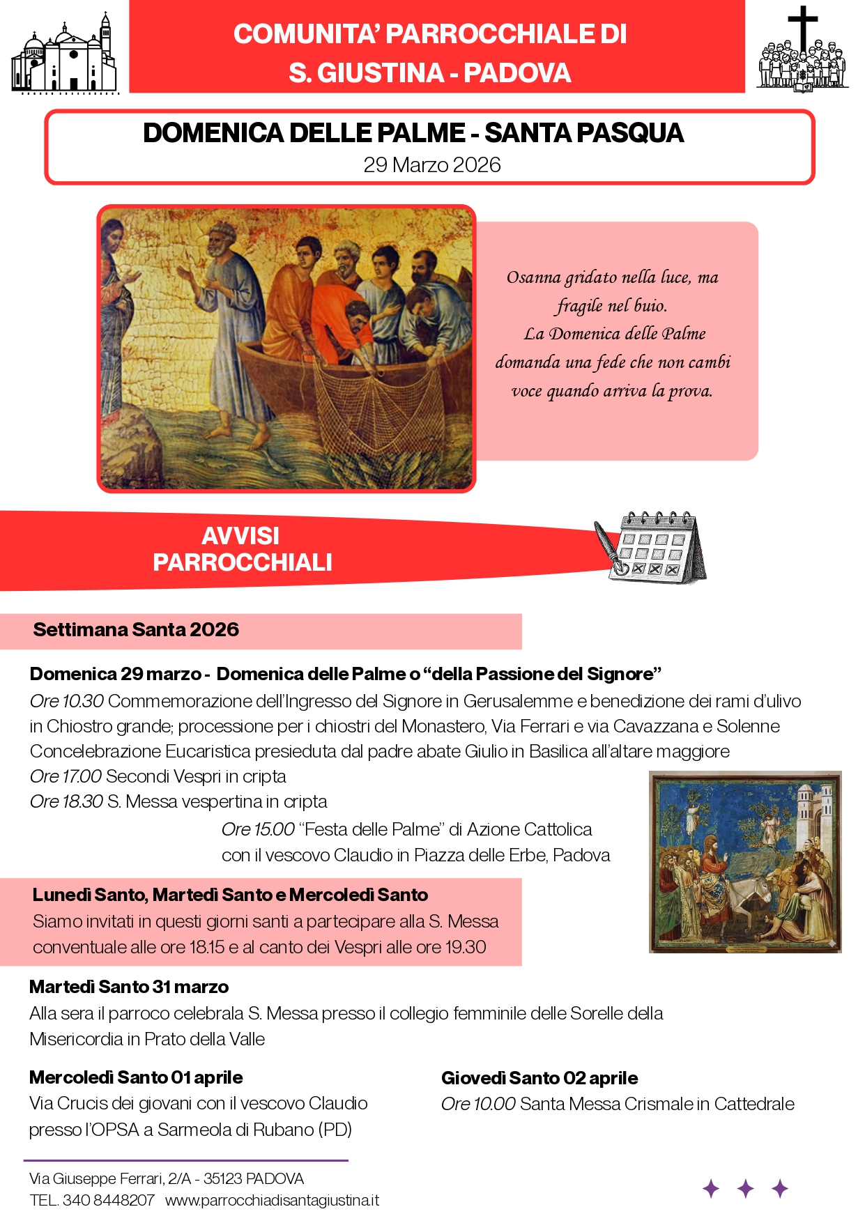 Con l’inizio della Settimana Santa, la Parrocchia di S. Giustina V. e M. ha predisposto il nuovo Bollettino Parrocchiale, che si può scaricare (come i precedenti) gratuitamente sia dal sito parrocchiale, come da questo sito alla pagina “Parrocchia“.