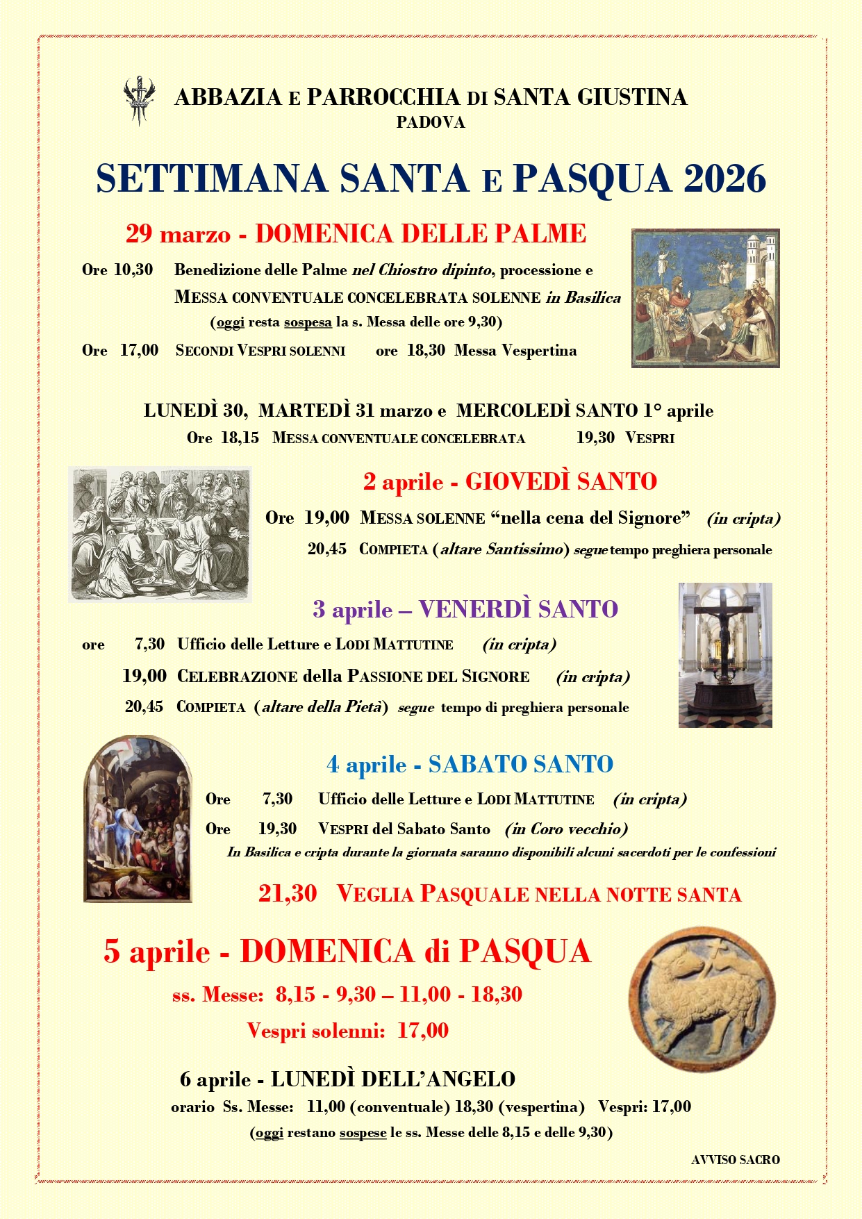Si pubblicano gli orari delle celebrazioni liturgiche della Settimana Santa e della Pasqua 2026, come da locandina.